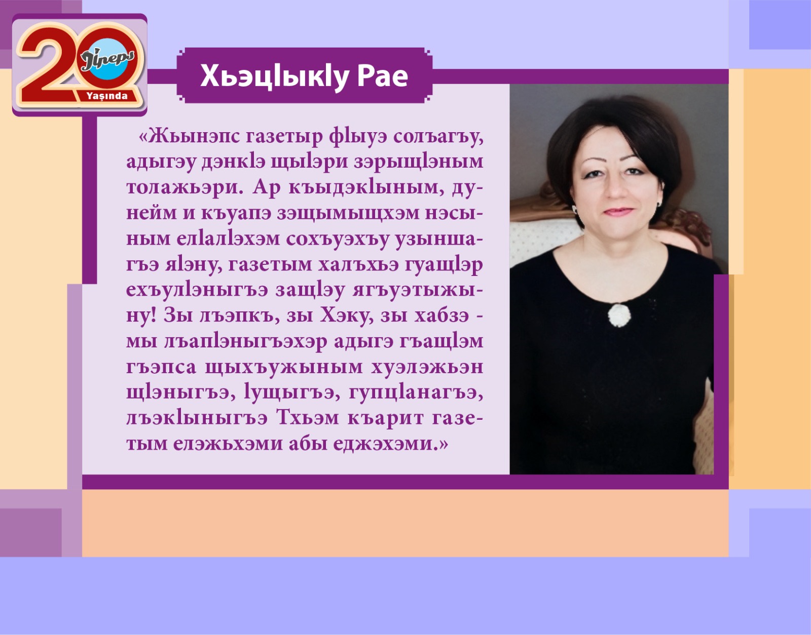 Hatsuk Raya: “Çerkeslerin nerede olurlarsa olsunlar birbirlerini tanımalarını sağlamak için yaptığı çalışmalardan dolayı Jineps gazetesini çok seviyorum. Gazetenin basımında ve dünya çapında dağıtımında emek veren çalışanlarına sağlık ve esenlik diliyorum, çabalarının başarı getirmesini temenni ediyorum! Tek bir halk, tek bir vatan, tek bir gelenek… Tanrı, gazete çalışanlarına ve okurlarına bu değerleri Çerkes yaşamının temeli haline getirmek için bilgi, bilgelik, samimiyet ve güç versin.”