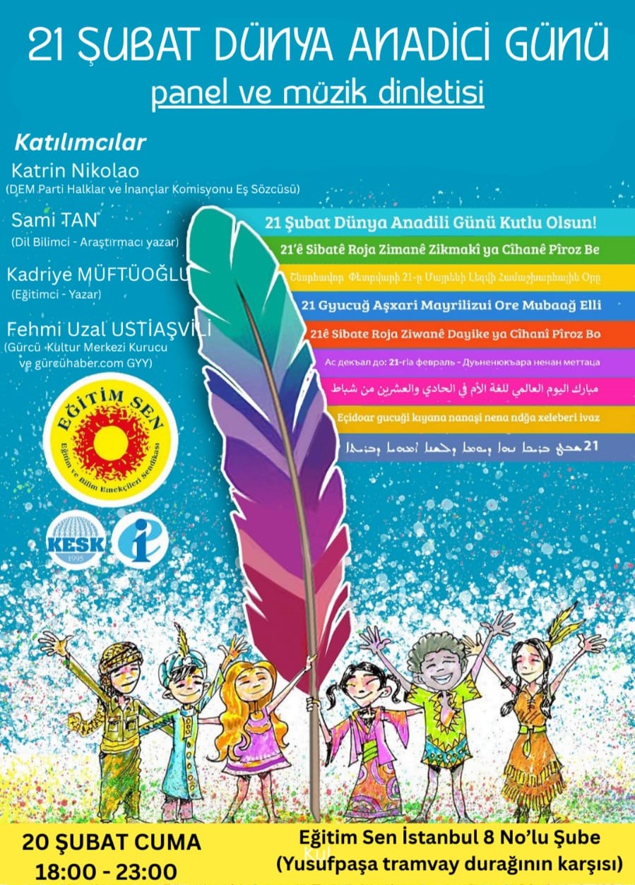 Eğitim Sen İstanbul 8 No’lu Şube 20 Şubat Cuma akşamı 21 Şubat Dünya Anadili Günü vesilesiyle panel ve müzik dinletisi düzenliyor.