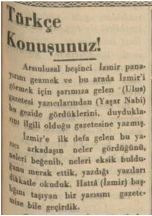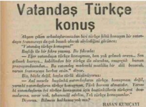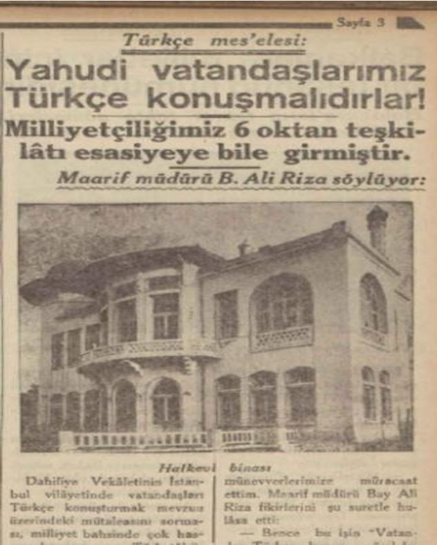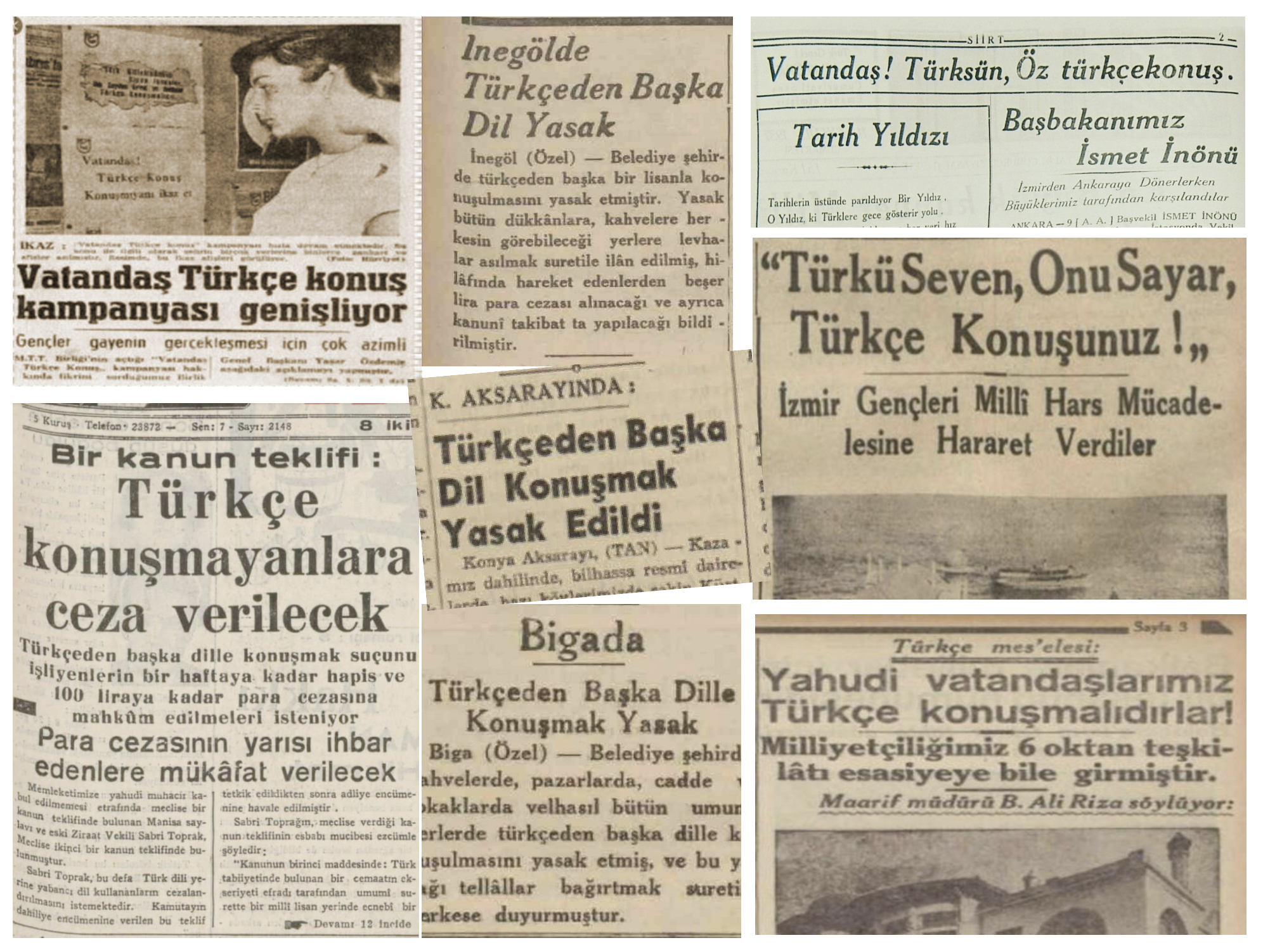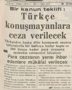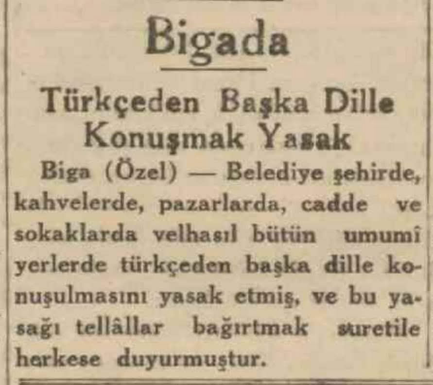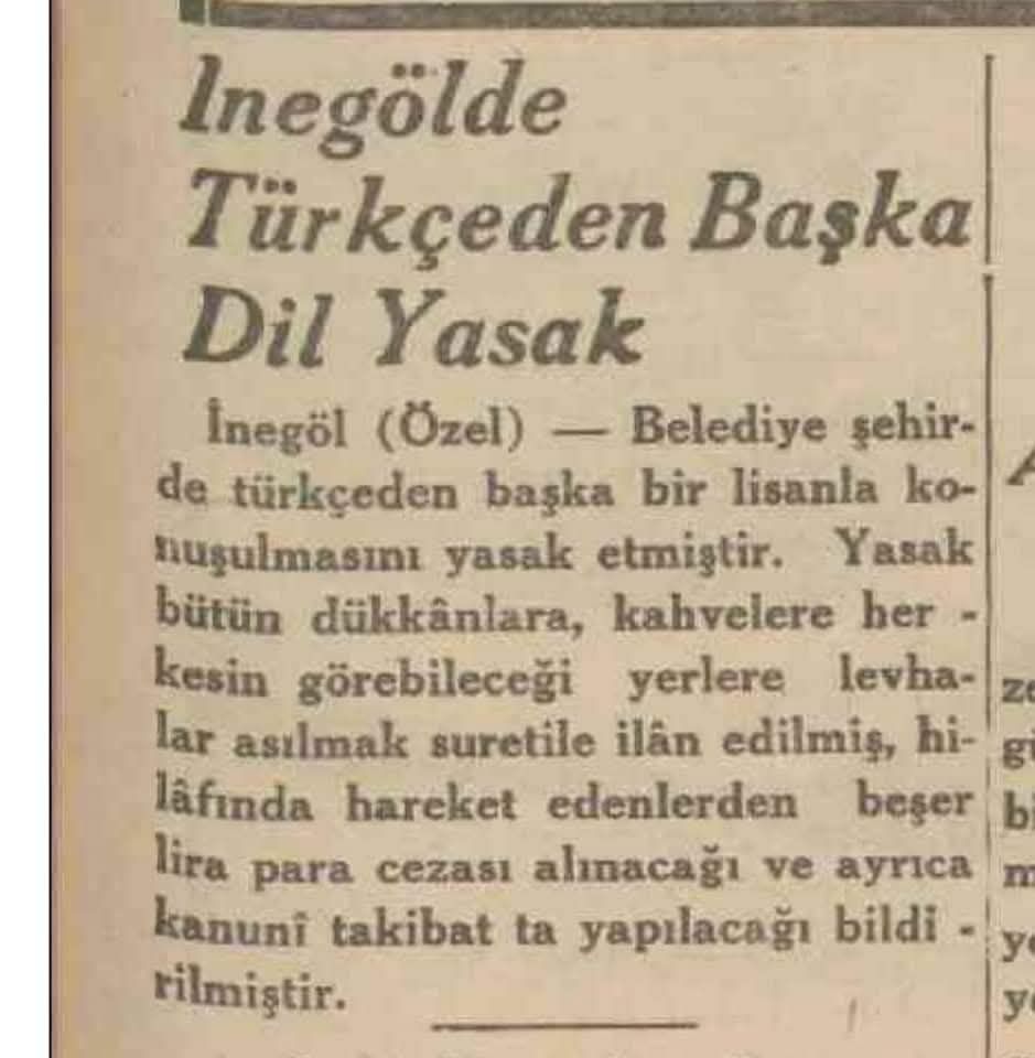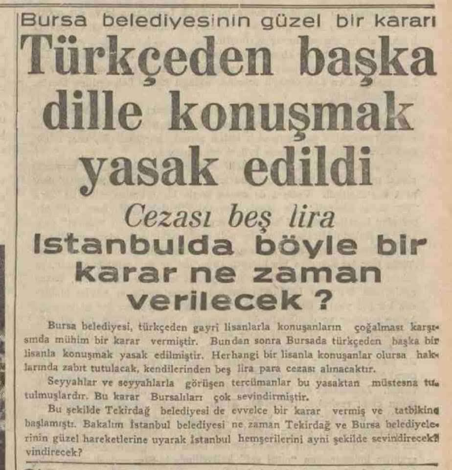 8 Ocak 1938 tarihli “Haber” gazetesinden: Türkçeden başka dil konuşanlara 1 haftaya kadar hapis ve 100 lira, (günümüzün 1 Milyon lirası) para cezası verilecek. Paranın yarısı Türkçeden başka dil konuşanları ihbar edenlere mükâfat olarak verilecektir.