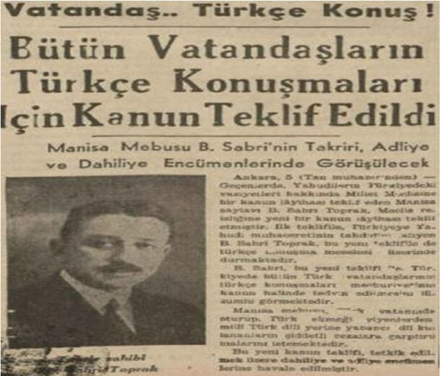 Türkçe konuşmayanların cezalandırılmasına dair bahsi geçen kanun teklifi Manisa’dan III, IV ve V. dönemlerde milletvekili seçilen, 19 Şubat 1938’de vefat eden Mehmet Sabri Toprak’a ait.