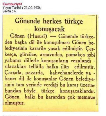 21 Mayıs 1936; Gönen Belediyesi çarşıda, pazarda, kahvehanelerde Çerkesçe, Gürcüce, Arnavutça, Pomakça gibi ‘yabancı dillerle’ konuşmanın yasaklandığını, konuşanların cezalandırılacaklarını tellal aracılığıyla duyurdu (Cumhuriyet gazetesi).