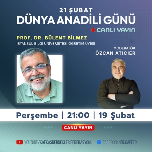 Kafkas Dernekleri Federasyonu 19 Şubat Perşembe akşamı saat 21.00’de 21 Şubat Dünya Anadili Günü kapsamında canlı yayın yapacak. İstanbul Bilgi Üniversitesi Öğretim Üyesi Prof. Dr. Bülent Bilmez’in konuk olacağı programın moderatörlüğünü Özcan Atıcıer üstlenecek.