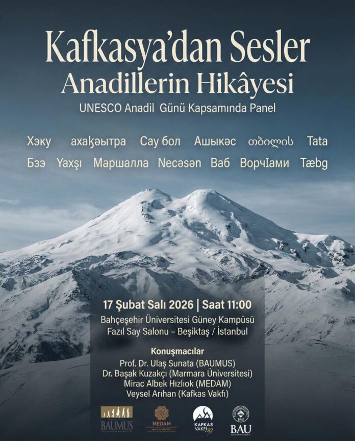 21 Şubat Dünya Anadili Günü kapsamındaki panel, Bahçeşehir Üniversitesi’nin ev sahipliğinde “Kafkasya’dan Sesler: Anadillerin Hikâyesi” başlığıyla düzenleniyor. Panele konuşmacı olarak Prof. Dr. Ulaş Sunata (BAUMUS), Dr. Başak Kuzakçı (Marmara Üniversitesi), Mirac Albek Hızlıok (MEDAM) ve Veysel Arıhan (Kafkas Vakfı) katılıyor.