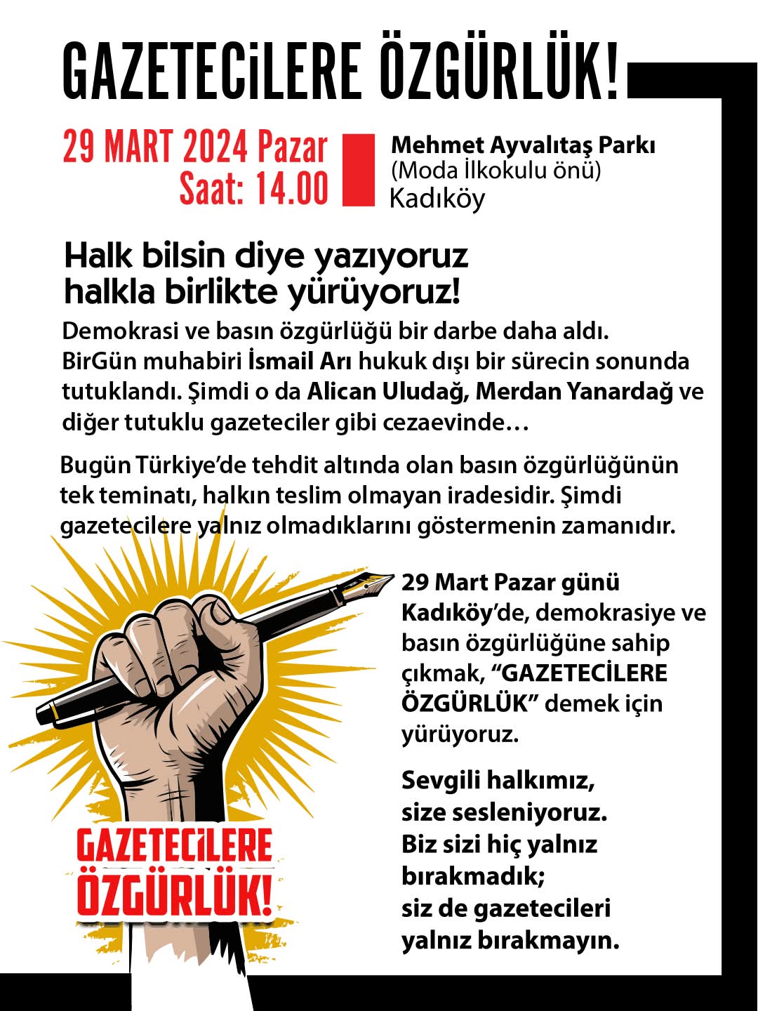 Gazeteciler basın ve ifade özgürlüğüne yönelik baskılara dikkat çekmek için 29 Mart Pazar günü saat 14.00’te İstanbul’da bir yürüyüş düzenliyor. “Gazetecilere özgürlük” başlıklı yürüyüş Kadıköy, Mehmet Ayvalıtaş Parkı’ndan (Moda İlkokulu önü) başlayacak.