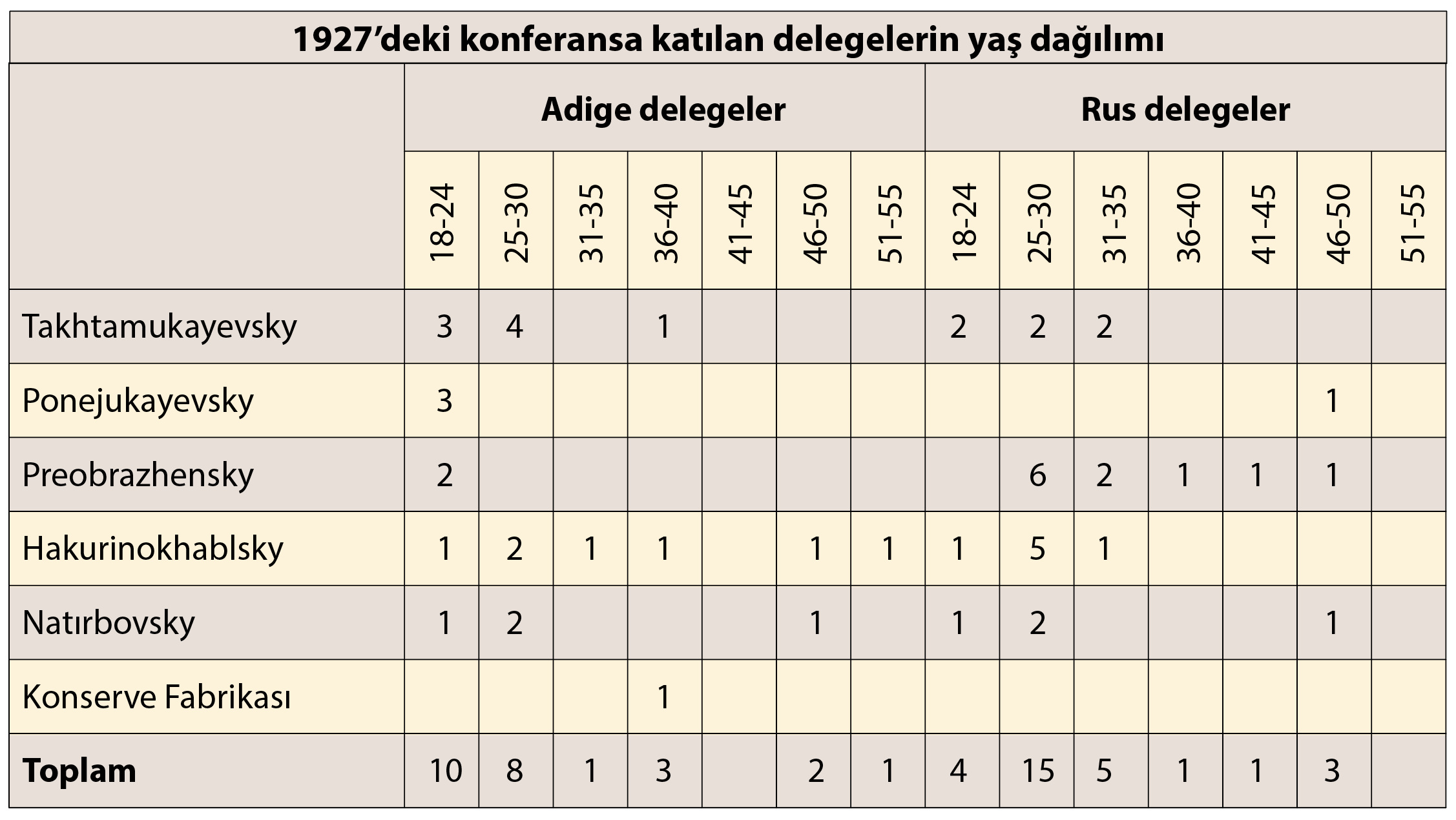 Böylece, her iki milletten delegelerin ağırlıklı olarak genç kadınlardan oluştuğunu görüyoruz; ancak Rus kadınları ağırlıklı olarak evliydi, Adige kadınları ise tam tersiydi.