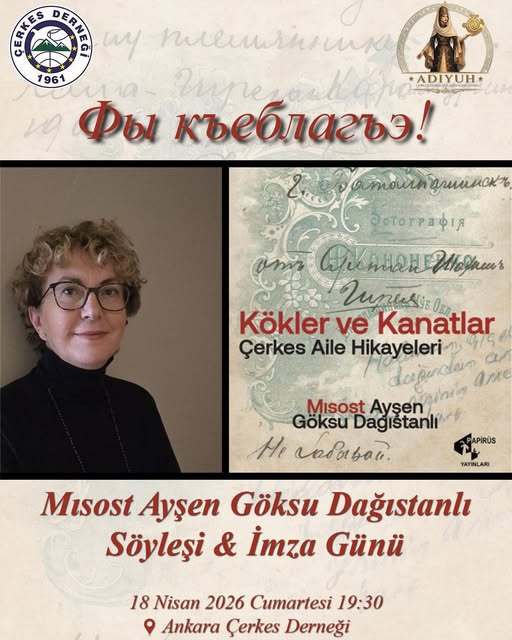 Mısost Ayşen Göksu Dağıstanlı, Papirüs Yayınları etiketiyle yayımlanan “Kökler ve Kanatlar-Çerkes Aile Hikâyeleri” adlı kitabını imzalamak ve söyleşiye katılmak üzere 18 Nisan’da Ankara Çerkes Derneği’ndeydi.