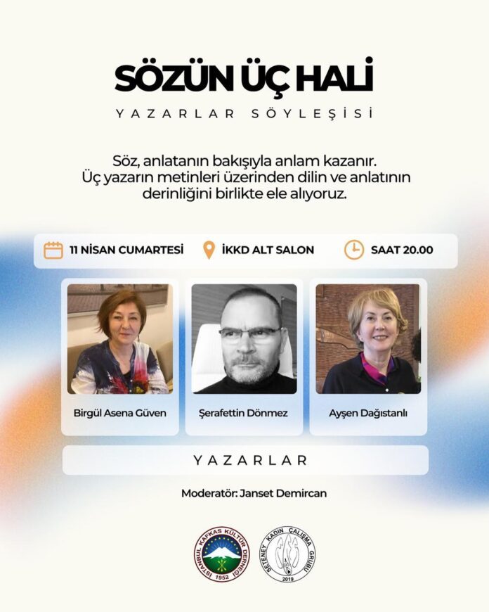 İstanbul Kafkas Kültür Derneği (İKKD), 2019’dan bu yana dernek bünyesinde faaliyetlerini sürdüren Seteney Çalışma Grubu’nun koordinasyonunda ‘Sözün Üç Hali-Yazarlar Söyleşisi’ başlıklı etkinliği düzenliyor.